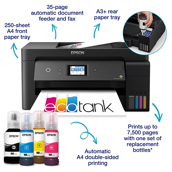 The Epson EcoTank L14150 is a powerful multifunction inkjet printer that supports printing up to A3+, making it ideal for businesses, creatives and offices with larger printing needs. The ink tank system offers an extremely low cost per page and easy refilling, contributing to long-term cost efficiency and increased productivity. The device combines printing, scanning, copying and faxing in one compact solution, allowing for better workspace organisation.